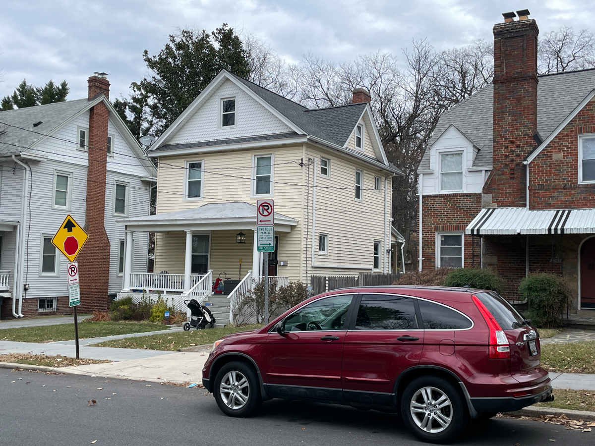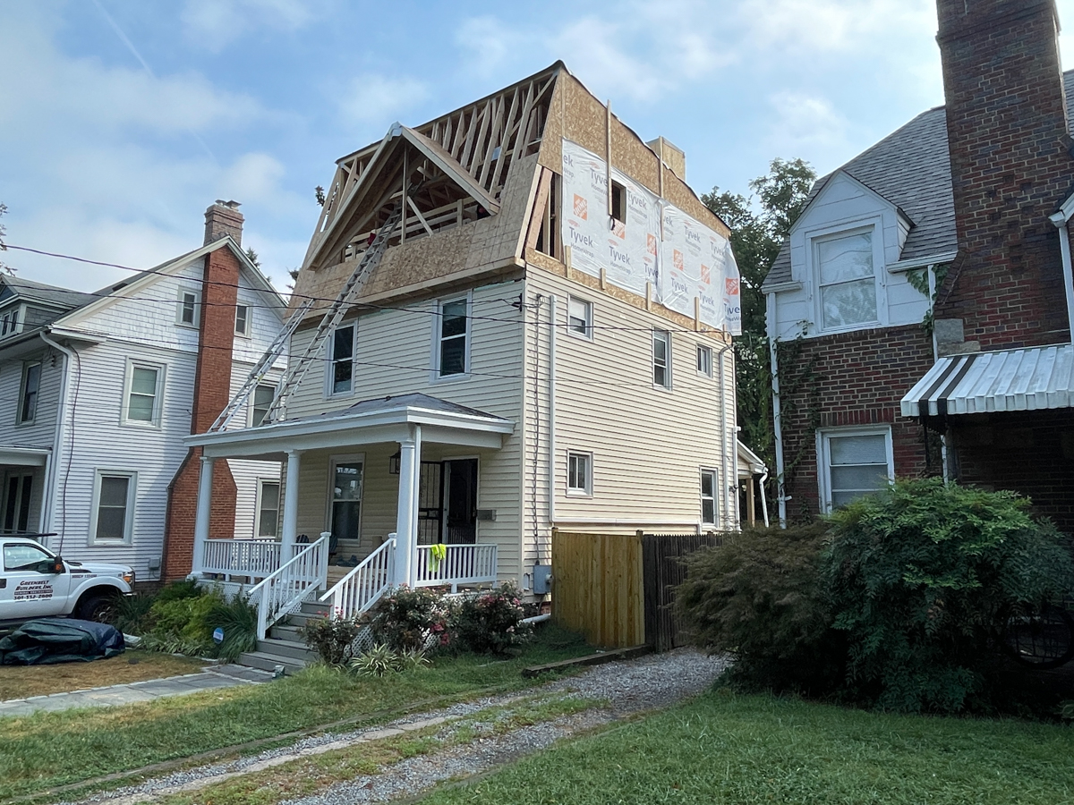 Exterior framing of the full third floor addition progressed over the course of about two weeks. The main roof was framed using trusses that pitch towards the back of the house. The front dormer is a distinguishing feature of the front facade. The gable silhouette is a nod to the former gable roof and will be a focal point of the new primary bedroom, with a view to the National Shrine. Rigid insulation wraps the addition to create a continuous thermal break.