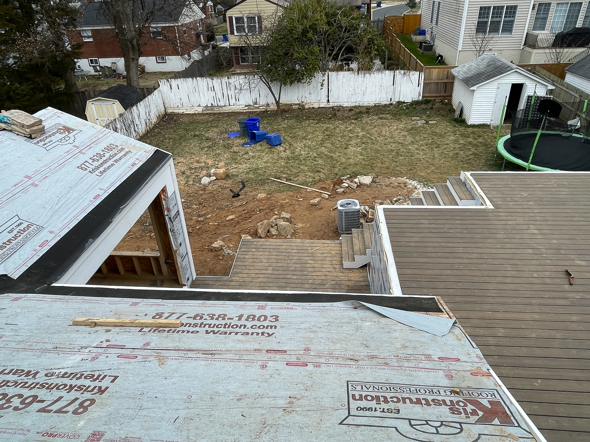 Siding is going up in some areas but will have to wait for our delayed window order. The rear multi-zone outdoor living space consists of a two-tiered rear deck, and four-season sunroom. The upper deck is actually the roof of the ground floor grandmothers suite. We originally had a wrap-around ramp in the plans but this was replaced with a future interior lift option.
