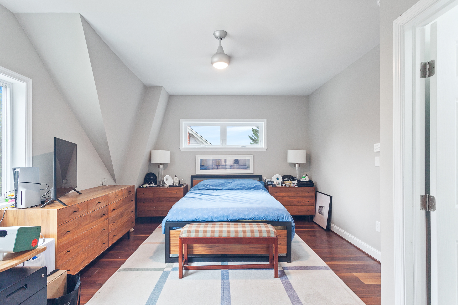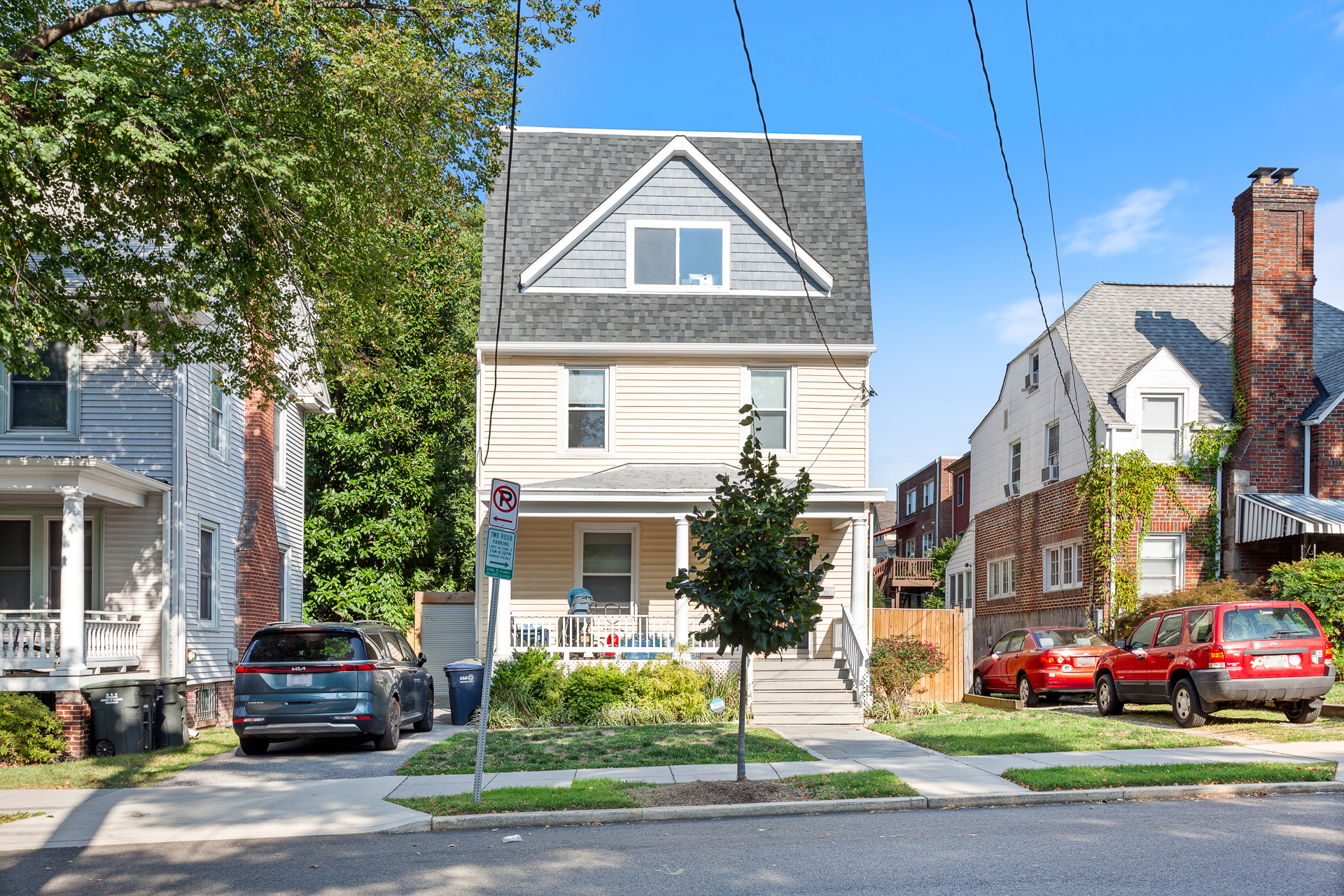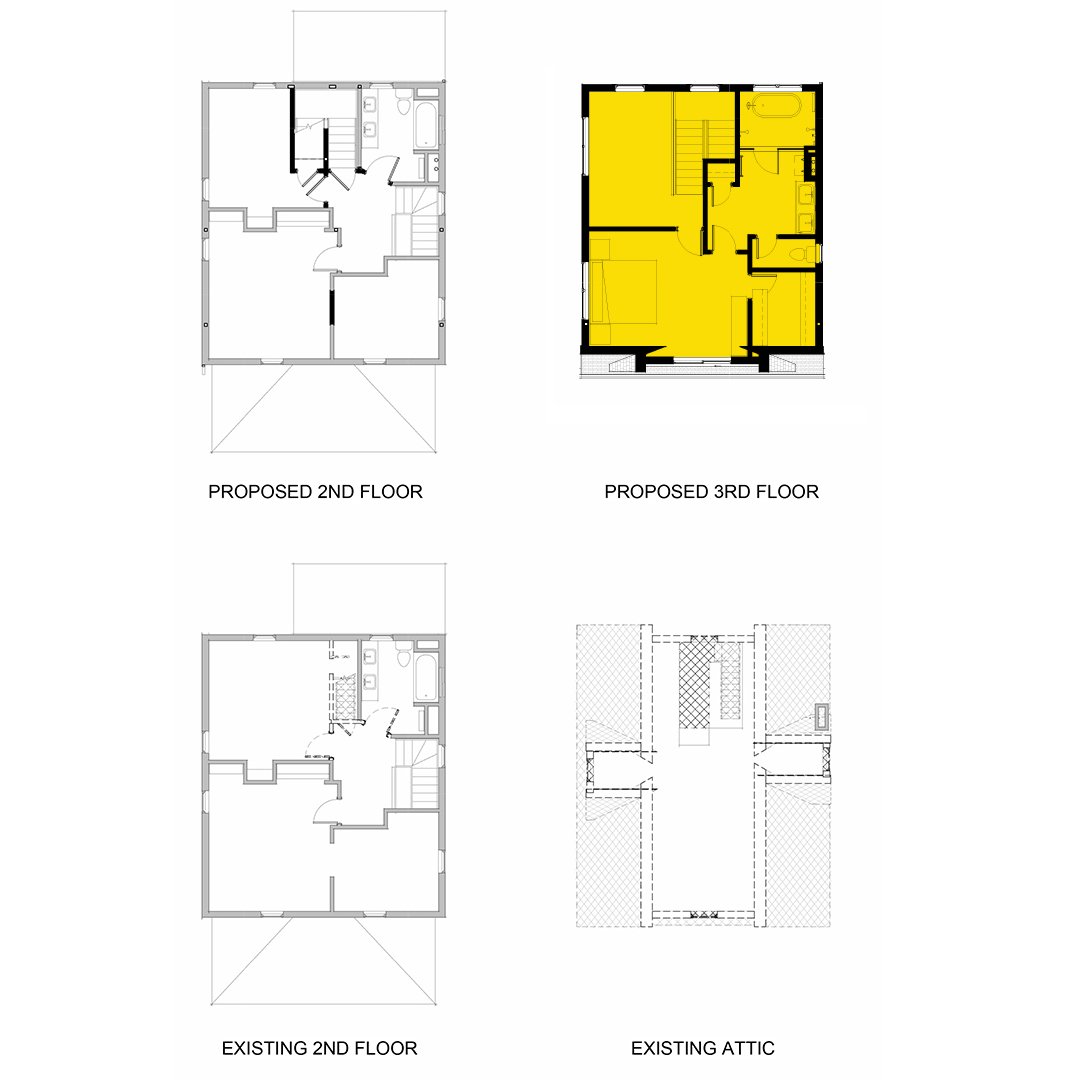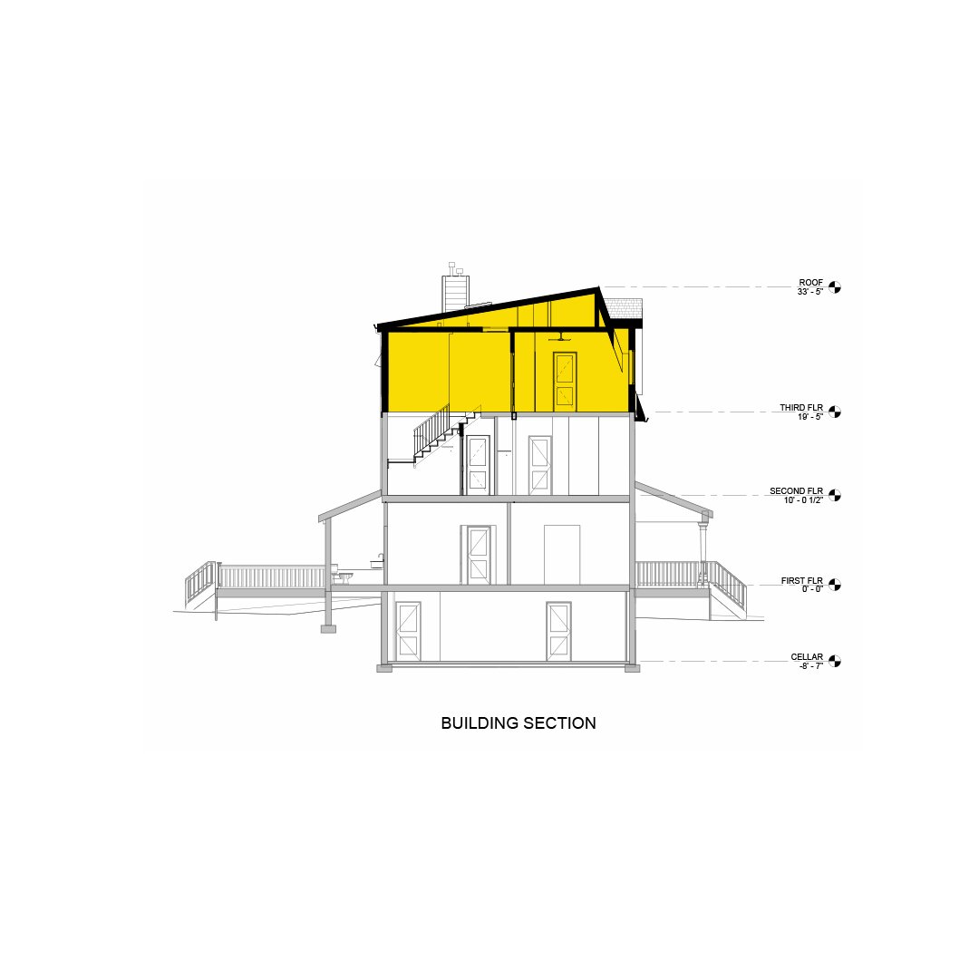 In order to create more space for an expanding family in Brookland, we’re converting an existing attic to a full third floor. The existing attic was significantly under-utilized due to the sloping ceilings. The new floor will replace the entire roof framing with a full floor to provide a new primary suite, including a walk-in closet. The remaining floor space will be used as an open gym space. From the street, the design preserves the original character of the home, keeping the existing front gable as a dormer feature. A complementary vertical siding on the addition helps to harmoniously scale the addition to it’s neighbors.