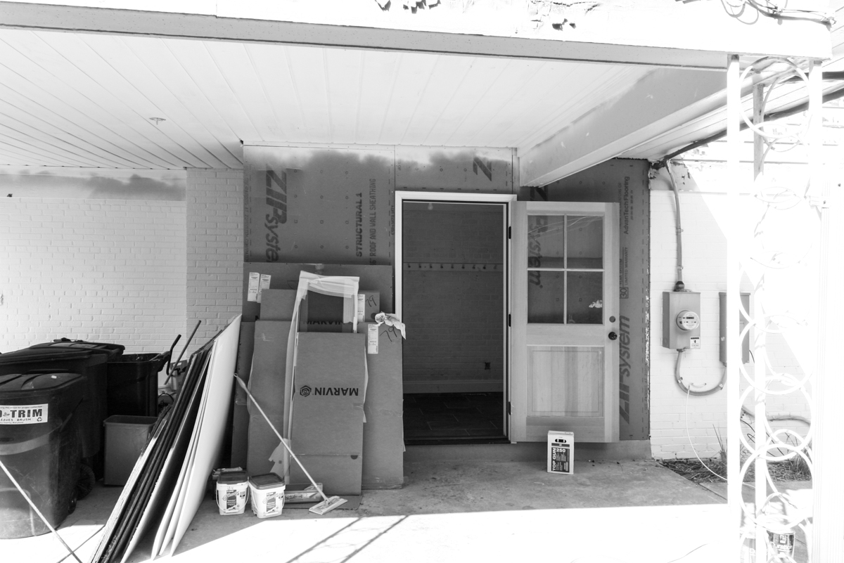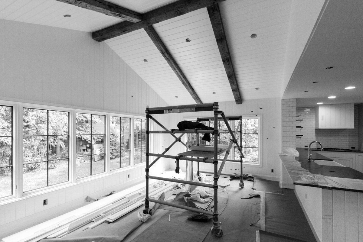The kitchen is now mostly complete with cabinets, countertops, and appliances installed. Wood floating shelves will eventually occupy the corner wall adjacent to the range. Pendant lights will run along the L-shaped peninsula. The dining room wood paneling and reclaimed ceiling beams are now installed adding both subtle texture as well as natural elements. A pair of pendant lights will hang above the dining table, and will be supplemented with recessed lighting. Glazing on all three walls immerses the dining space into the backyard vegetation, while the large opening to the kitchen adds to the overall spaciousness of the room.