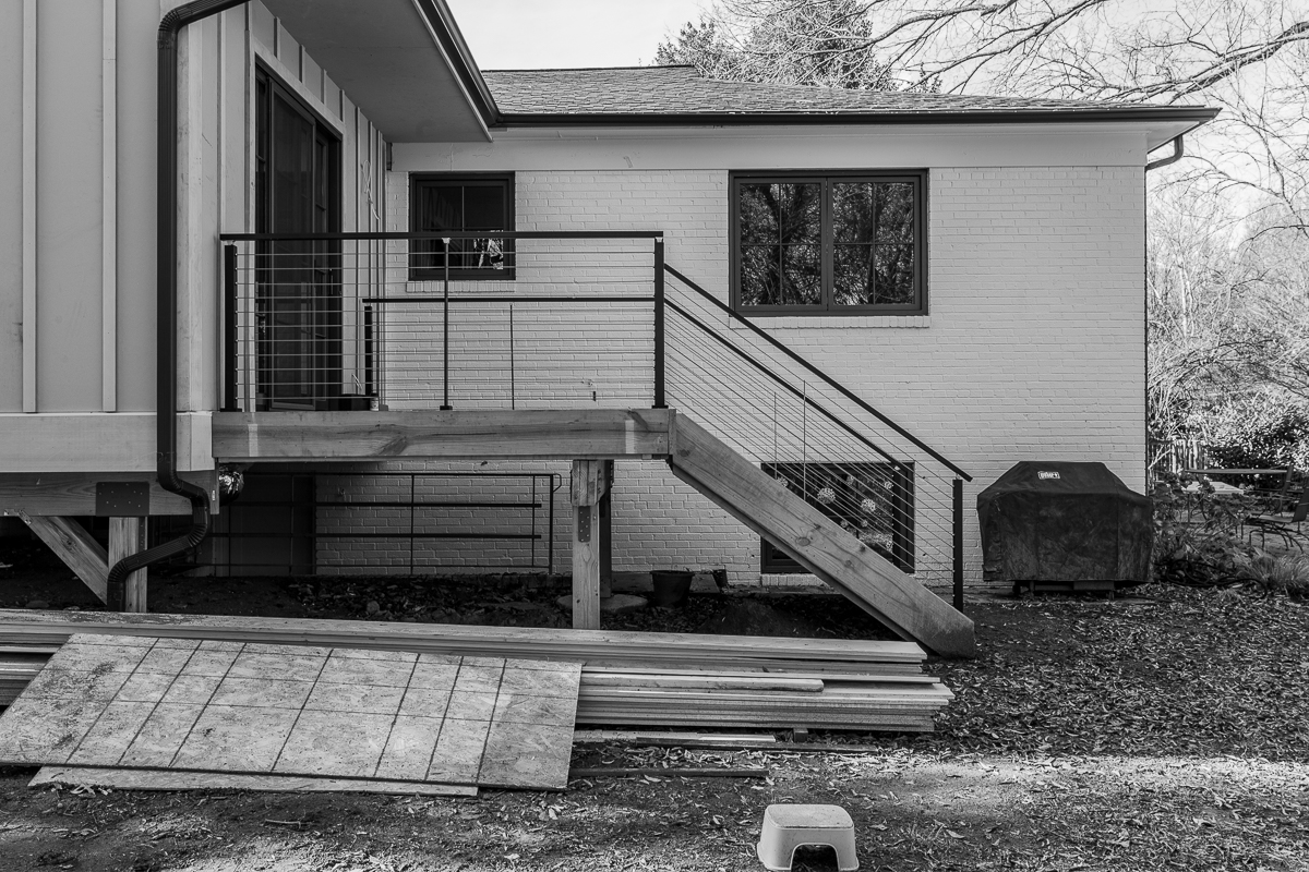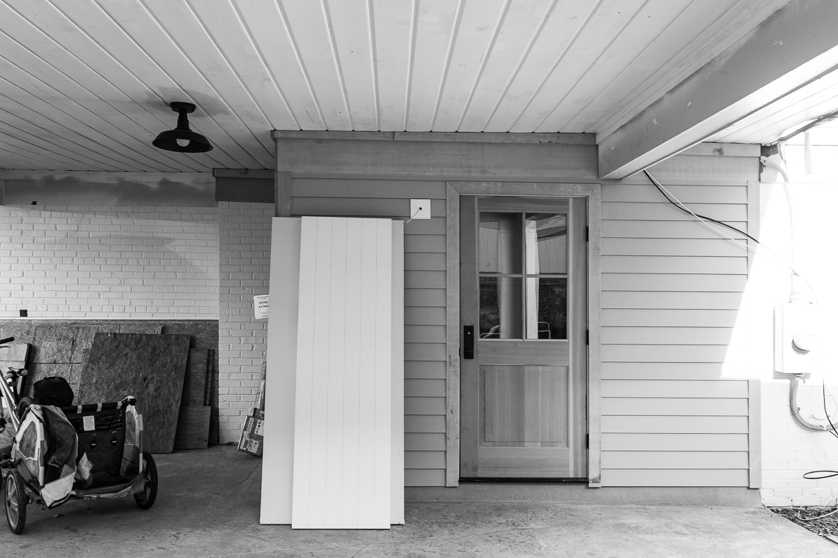 The new column cladding at the carport is installed, and does a much better job of unifying the entire exterior appearance. You can see the previous metal columns and proposed rendering on the Silver Spring Addition portfolio page.