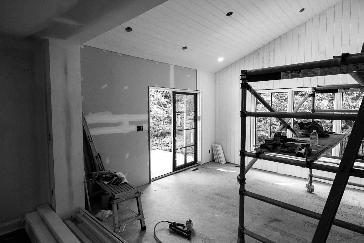 Installation of the Dining room wood paneling and reclaimed wood beams are underway, again layering more texture and scale to the large window openings.