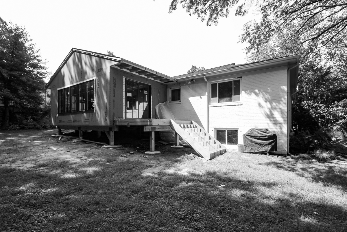 The muntin framing in the Addition windows are starting to add some scale to the exterior of the dining room and will be complemented nicely with the vertical batten siding. Framing on the deck stair has also started an aligns nicely with the new sliding patio door opening.