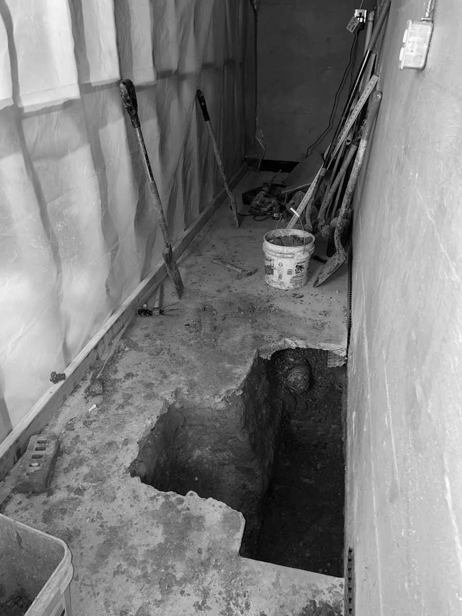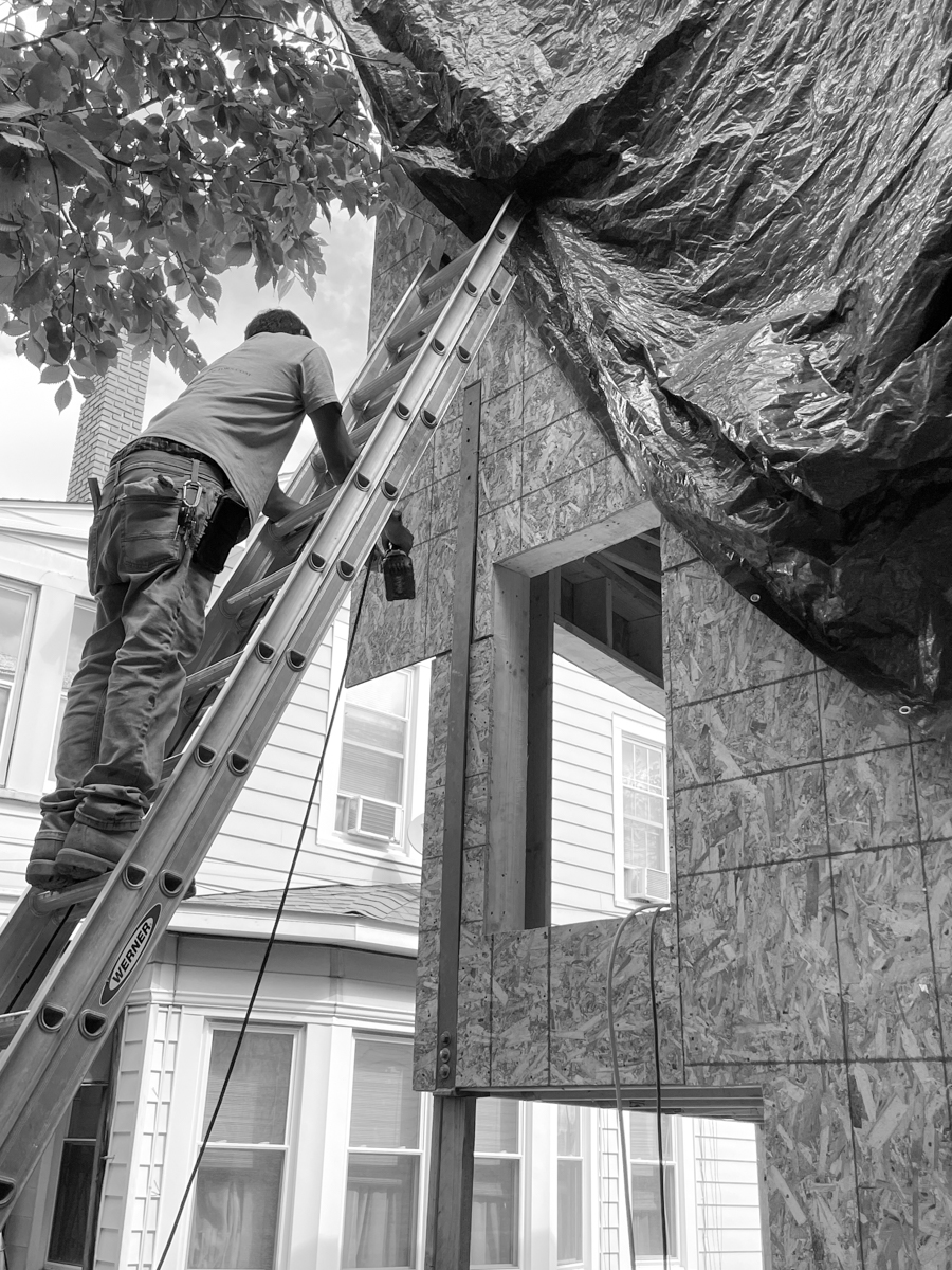 The corner bay window was initially framed with temporary shoring. A steel hanger was used to secure the bay framing to a cantilevered LVL beam above at the second floor. The addition is partially supported on the existing bearing wall which did not have a footing per the geotechnical report. As a result, underpinning was required in the basement to add a new footing to safely bear on the soil.